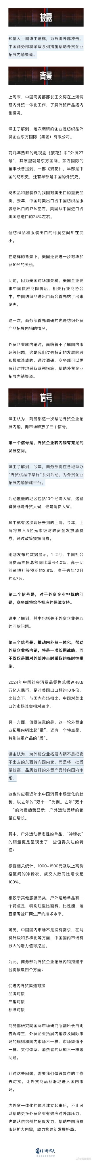 来源:玉渊谭天 【#商务部将为外贸企业提供必要支持#】#商务部将帮助外贸企业拓内销# 知情人士向谭主透露,为抵御外部冲击,中国商务部将采取系列措施帮助外贸企业拓展内销渠道。上周末,中国商务部长已经对上海外贸企业进行了...