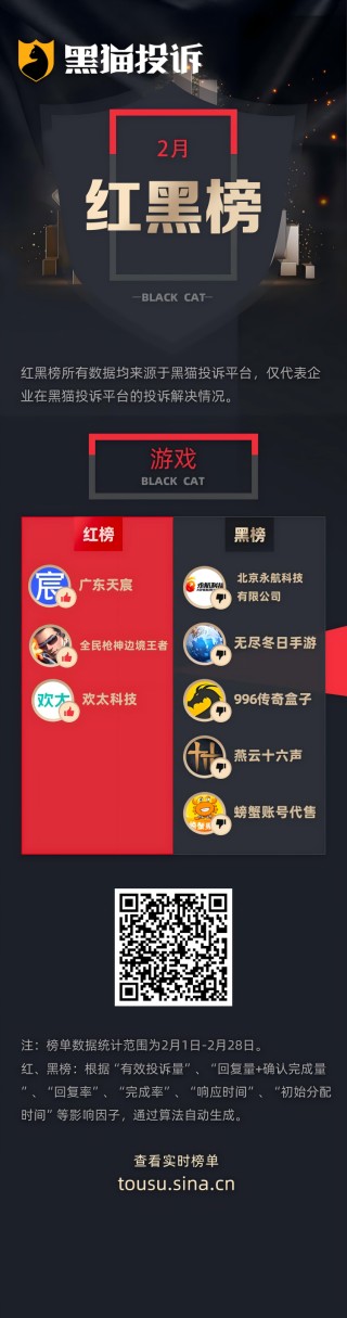 2月黑猫投诉企业红黑榜:北京永航科技有限公司游戏抽奖概率极低
