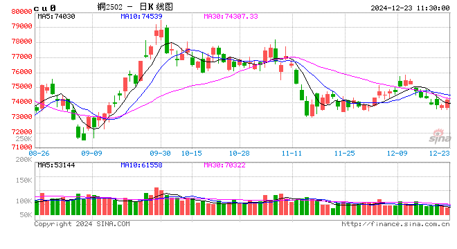 长江铜业网讯:今日沪铜高开,09:01主力月2501合约开盘价报74130元/吨,涨400元。美联储官员鹰调下多头有所顾忌限制铜价涨势;同时,美联储鹰派勾勒出的利率前景预示着明年降息次数的大幅减少,这使得市场对未来降息路径的不确定性持续存在。但国内库存续降给予支撑,目前处于2月以来的最低水平。加之铜精矿加工费依然维持在较低水平,这对2025年中国冶炼厂的盈利能力构成了显著提升的预期,进而稳固了铜金属的供应基本面。此外,随着年末氛围愈发浓厚,市场关注焦点也转向美元的强劲走势。不过,美国最为青睐的通胀数据PCE意外下降,给近期势头强劲的美元泼了一盆冷水,使得市场的避险情绪有所缓解,为铜价的企稳回升创造了有利条件。据此预计,今日现货铜价将呈现上涨态势。