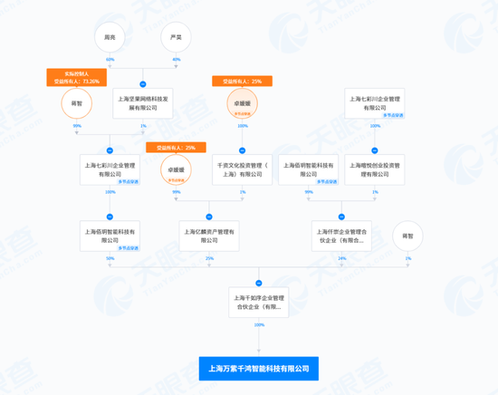 千如序再向上穿透,共涉及6家公司,除了上海亿麟资产管理有限公司、上海坚果网络科技发展有限公司,其余4家公司——上海仟崇企业管理合伙企业(有限合伙)、上海佰玥智能科技有限公司、上海暄悦创业投资管理有限公司、上海七彩川企业管理有限公司的实控人均为蒋智,且持股比例均为99%。