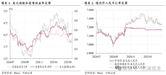 2024年美国大选结果出炉至今,特朗普政策是扰动全球金融市场的重要因素。1月中旬,特朗普交易推动10年期美债收益率和美元指数最高分别升至4.8%、109.6,分别为2023年11月1日、2022年11月10日以来新高。此后,随着特朗普交易回撤,美债收益率和美元指数震荡回落。2月份,10年期美债收益率回落34个基点至4.2%,美元指数下跌0.9%至107.6(见图表1)。