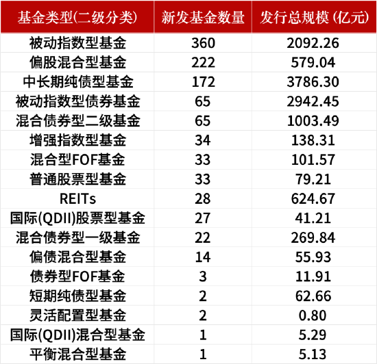 从基金类型数量来看,被动指数型基金数量第一,合计360只;偏股混合型基金数量第二,合计222只;中长期纯债型基金也是热门类型,共发行172只。此外,混合债券型二级基金、被动指数型债券基金发行数量均为65只;增强指数型基金、混合型FOF基金、普通股票型基金发行数量超32只。相比之下,国际(QDII)混合型基金、平衡混合型基金数量最少,均只有一只。