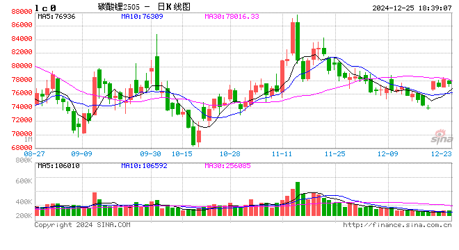碳酸锂期货高开低走,主力合约2505开盘价78000元,盘中高点78100元,低点77140元,结算价77480元,收盘价77500元/吨,跌360元,跌幅0.46%。成交量118205手,持仓量163546手增加2793手。