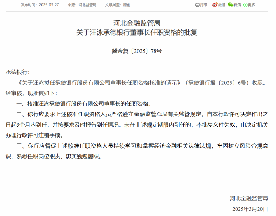 3月28日金融一线消息,河北金融监管局发布三则批复,核准汪泳承德银行董事长、张建军承德银行副董事长、张建军承德银行行长的任职资格。